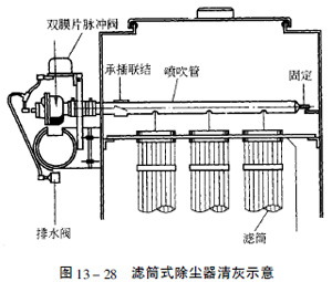 由于濾芯本身是一個硬固體,不再配置骨架,所以濾芯的清灰與傳統的濾袋清灰不同。圖13—28所示是用一個脈沖閥噴吹三個排在一起的濾芯。濾芯的總過濾面積應有限制。